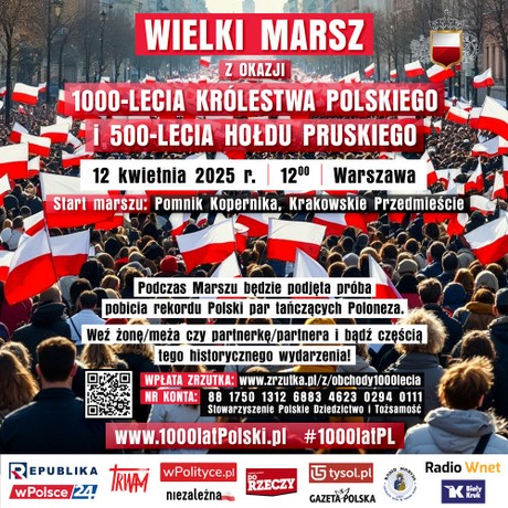 W tym roku, nasze państwo, my wszyscy przyznający się do Polski, obchodzimy wyjątkowe rocznice: 1000-lecia Królestwa Polskiego oraz 500 lat od Hołdu Pruskiego.Pomimo pedagogiki wstydu w 3RP wspieranej, przez niestety cały czas obecne w Polsce zewnętrzne wpływy – fakty są nieubłagane.