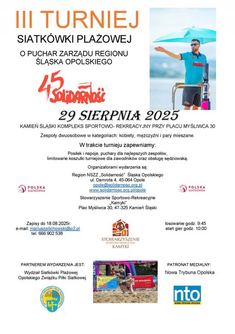 W dniu 29 sierpnia 2025 r. na obiektach kompleksu sportowo-rekreacyjnego w Kamieniu Śląskim odbędzie się III turniej siatkówki plażowej o puchar Zarządu Regionu Śląska Opolskiego NSZZ „Solidarność”.W turnieju występować będą zespoły dwuosobowe w kategoriach: kobiety, mężczyźni i pary mieszane.