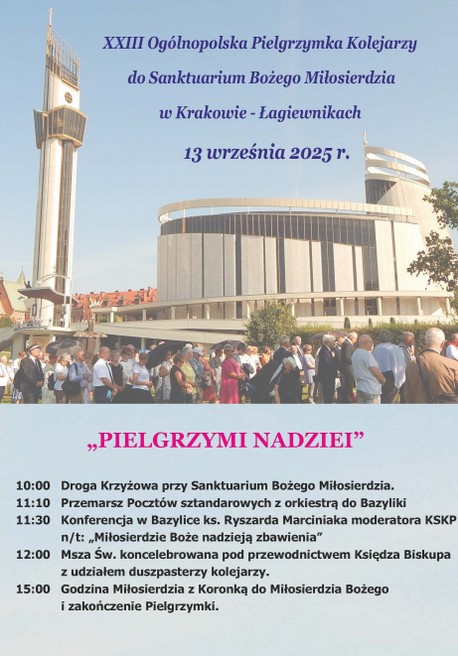 XXIII Ogólnopolska Pielgrzymka Kolejarzy do Sanktuarium Bożego Miłosierdzia w Krakowie-Łagiewnikach odbyła się 13 września 2025 r. pod hasłem „Pielgrzymi Nadziei”. Głównym punktem pielgrzymki była Msza św. pod przewodnictwem ks. abp Marka Jędraszewskiego.W pielgrzymce uczestniczyli duszpasterze kolejarzy, przedstawiciele władz państwowych, samorządowych i kolejowych, prezesi spółek, dyrektorzy, poczty sztandarowe oraz pracownicy kolei z różnych stron Polski.