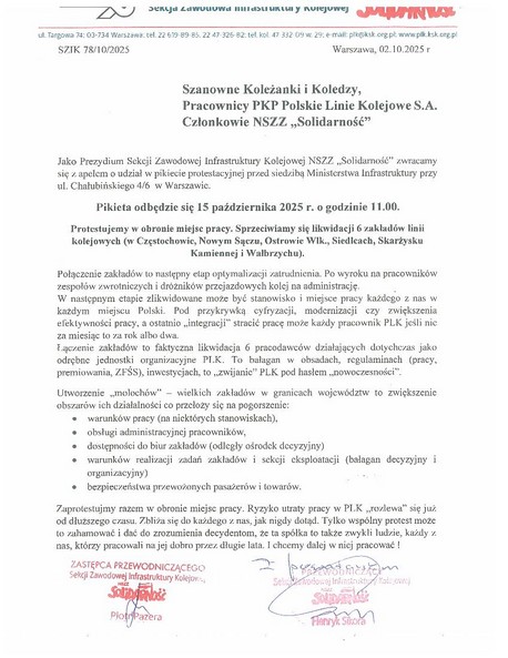 Sekcja Zawodowa Infrastruktury Kolejowej NSZZ „Solidarność” zwróciła się do pracowników PKP Polskie Linie Kolejowe S.A. z apelem o udział w pikiecie protestacyjnej przed siedzibą Ministerstwa Infrastruktury przy ul. Chałubińskiego 4/6 w Warszawie.Pikieta odbędzie się 15 października 2025 r.
