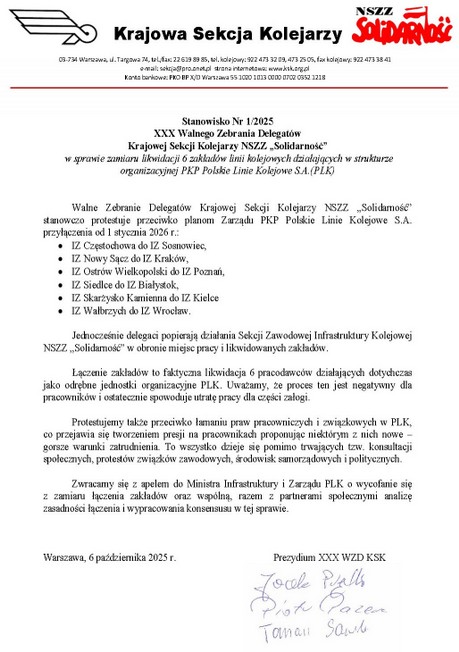 Wracając do zjazdu KSK, delegaci oprócz wyborów dyskutowali o najważniejszych problemach występujących w branży, czego owocem było przyjęcie dwóch stanowisk. To pierwsze dotyczyło likwidacji 6 zakładów linii kolejowych i zmniejszenia ich ilości z 23 do 17 zakładów. W stanowisku delegaci zaprotestowali przeciwko likwidacji, apelując o wstrzymanie decyzji i podjęcie rozmów ze związkami zawodowymi aż do uzyskania szerszej akceptacji społecznej.