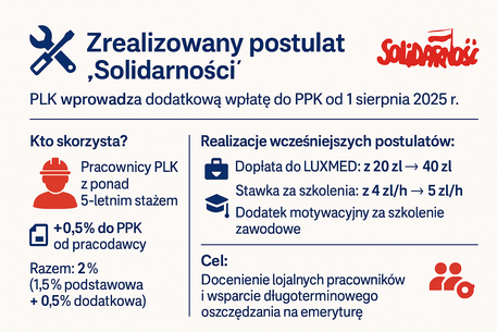 Zarząd PLK podjął decyzję w sprawie finansowania przez PLK od 1 sierpnia 2025 r. dodatkowej wpłaty do Pracowniczych Planów Kapitałowych (PPK) w wysokości 0,5% dla pracowników, których staż pracy w PLK SA wynosi ponad pięć lat.To kolejny postulat Sekcji Zawodowej Infrastruktury Kolejowej NSZZ „Solidarność” zgłoszony do PLK jeszcze w ubiegłym roku i negocjowany w ramach dialogu społecznego, który został zrealizowany.