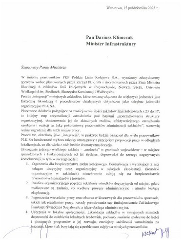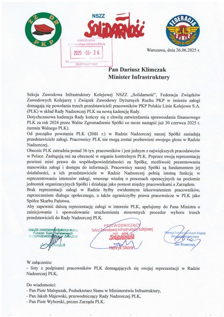 W połowie czerwca br. posłowie: Michał Moskal, Andrzej Adamczyk i Rafał Weber zwrócili się do ministra infrastruktury z interpelacją w sprawie planów zapewnienia dalszej obecności przedstawicieli pracowników PLK w Radzie Nadzorczej Spółki.W interpelacji czytamy: PLK jako kluczowy zarządca infrastruktury kolejowej w Polsce odgrywa strategiczną rolę w realizacji inwestycji kolejowych, modernizacji linii oraz zapewnieniu bezpieczeństwa i dostępności transportu publicznego. Pracownicy spółki, liczący ponad 36 tysięcy osób, są fundamentem jej działalności, a ich przedstawiciele w Radzie Nadzorczej od 25 lat pełnią istotną funkcję w reprezentowaniu interesów załogi, wnosząc wiedzę o procesach operacyjnych i działając jako pomost między pracownikami a zarządem.