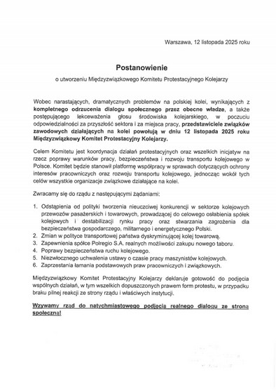 Obradująca 26 listopada 2025 r. Rada Sekcji Zawodowej Infrastruktury Kolejowej NSZZ „Solidarność” (SZIK) przeanalizowała dotychczasowe rozmowy strony związkowej z pracodawcą w sprawie Protokołu dodatkowego nr 16 do Zakładowego Układu Zbiorowego Pracy dla pracowników PLK.Widać to na przykładzie „egzekucji” PKP Cargo i jego bieżącej „wegetacji”, narastających zagrożeń dla PKP Intercity, spychanie w techniczno - organizacyjny niebyt Polregio czy ostatnie pomysły „unowocześniające” PKP PLK poprzez „wycięcie” z jej struktury 6 zakładów.