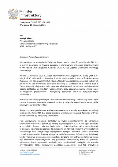 Sekcja Zawodowa Infrastruktury Kolejowej NSZZ „Solidarność” wystąpiła do Centrali PLK 26.02.2026 r. z pismem w sprawie tworzenia w branżach utrzymaniowych zespołów specjalistycznych, których celem ma być utrzymanie infrastruktury, głównie torów i rozjazdów. Centrala Spółki (Biuro Dróg Kolejowych) przekazała nam odpowiedz w tej sprawie, którą zamieszczamy poniżej.Wprowadzane zmiany mają na celu zwiększenie potencjału w zakresie realizacji zadań podstawowego utrzymania co bezpośrednio jest związane z koniecznością pilnego podniesienia poziomu bezpieczeństwa ruchu kolejowego.