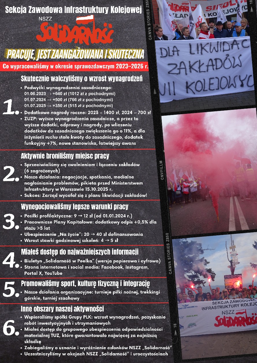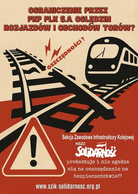 W trosce o bezpieczeństwo ruchu kolejowego, Sekcja Zawodowa Infrastruktury Kolejowej NSZZ „Solidarność” przeprowadziła w grudniu 2025 r. akcję informacyjną adresowaną do pracowników PLK oraz mediów.Informowaliśmy w niej o ryzyku obniżenia poziomu bezpieczeństwa na kolei. Nasz przekaz miał zwrócić uwagę, że planowane przez Zarząd PLK zmiany dotyczące utrzymania infrastruktury kolejowej (tory, rozjazdy) są nieprzemyślane i zwiększają ryzyko wykolejeń pociągów.