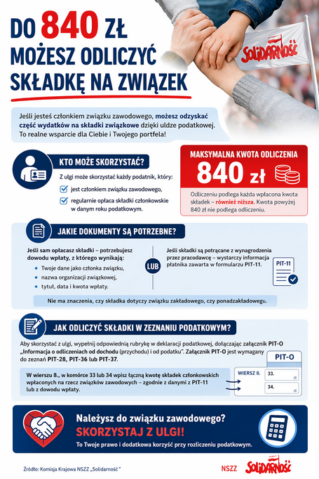 Jeśli należysz do związku zawodowego to możesz skorzystać z ulgi podatkowej polegającej na odzyskaniu części wydatków poniesionych na składki związkowe. Aby skorzystać z ulgi, podatnik musi być członkiem związku zawodowego i dokonywać regularnych opłat składek członkowskich. Odliczenie możliwe jest przy wypełnianiu deklaracji podatkowych PIT-28, PIT-36, lub PIT-37, zależnie od formy opodatkowania dochodu podatnika. Istotnym jest, aby składki zostały opłacone w danym roku podatkowym.Aby skorzystać z ulgi trzeba mieć dowód wpłaty składek członkowskich na rzecz związku zawodowego, z którego wynikają: