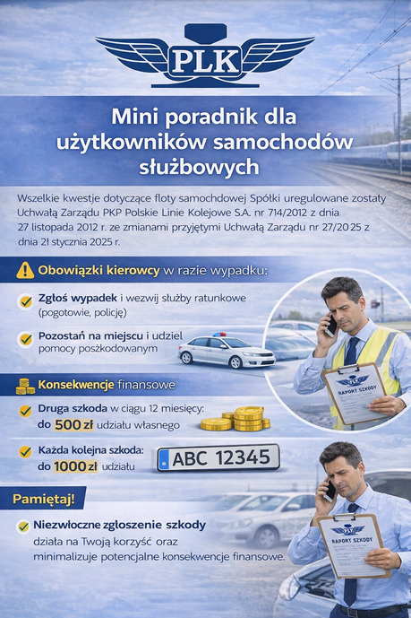 Wszelkie kwestie dotyczące floty samochodowej Spółki uregulowane zostały Uchwałą Zarządu PKP Polskie Linie Kolejowe S.A. nr 714/2012 z dnia 27 listopada 2012 r. ze zmianami przyjętymi Uchwałą Zarządu nr 27/2025 z dnia 21 stycznia 2025 r.