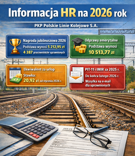 Biuro Spraw Pracowniczych przekazało najnowsze informacje dotyczące spraw pracowniczych - wybranych świadczeń obowiązujących w 2026 roku w PKP Polskie Linie Kolejowe S.A. Poniżej przedstawiamy informację PLK:- Zgodnie z Decyzją Nr 5/2026 Prezesa Zarządu z dnia 27 stycznia 2026 r. podstawa wymiaru nagrody jubileuszowej dla pracowników spółki w 2026 roku wynosi 5 212,95 zł. Uprawnionych do otrzymania nagrody jubileuszowej w 2026 toku jest 4 387 pracowników,