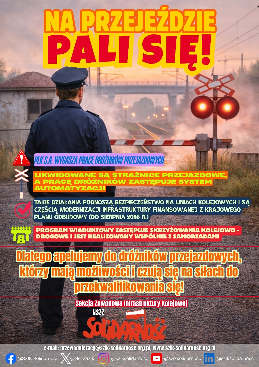 12 marca 2026 r. w siedzibie Komisji Krajowej NSZZ „Solidarność” w Warszawie odbyło się zebranie delegatów Sekcji Zawodowej Infrastruktury Kolejowej NSZZ „Solidarność” (SZIK) zrzeszającej organizacje zakładowe działające w jednostkach organizacyjnych PKP Polskie Linie Kolejowe S.A. (PLK) i w spółkach Grupy PLK.Najważniejszym dokumentem przyjętym na zebraniu było stanowisko w sprawie obniżenia bezpieczeństwa na liniach kolejowych zarządzanych przez PLK, w którym związkowcy krytycznie ocenili stan bezpieczeństwa na kolei.