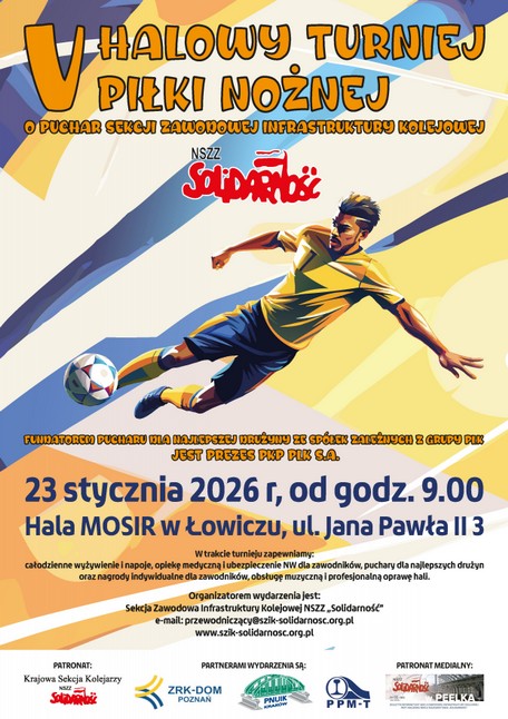 V Halowy Turniej Piłki Nożnej o Puchar Sekcji Zawodowej Infrastruktury Kolejowej NSZZ „Solidarność” (SZIK) pod patronatem Krajowej Sekcji Kolejarzy NSZZ „Solidarność” został rozegrany 23 stycznia 2026 r. w hali OSiR w Łowiczu. Wzięło w nim udział rekordowa ilość 20 drużyn (blisko 200 zawodników) reprezentujących jednostki organizacyjne PLK Polskie Linie Kolejowe S.A. i spółki Grupy PLK.Turniej wygrała reprezentacja ZLK Wałbrzych wygrywając w finale z drużyną Centrali PLK. Trzecie miejsce zajęła reprezentacja ZLK Częstochowa, a kolejne drużyna Pomorskiego Przedsiębiorstwa Mechaniczno-Torowego Sp. z o.o. w Gdańsku, która została wyróżniona pucharem dla najlepszej drużyny reprezentującej spółki zależne z Grupy PLK, który ufundował Pan Piotr Wyborski, prezes PKP Polskie Linie Kolejowe S.A.
